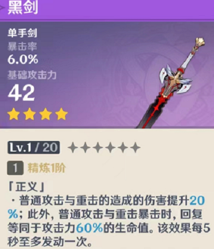 泛用性极强的单手剑,提升普攻和重击伤害,精5可达40%。造成暴击时还会回复自身血量,不过队伍里基本都会带盾奶,这点属于聊胜于无了。目前所有的单手剑主副c都可选择,如果你的刻晴、绫人和绫华还没有好的武器,可以考虑一下黑剑嗷。