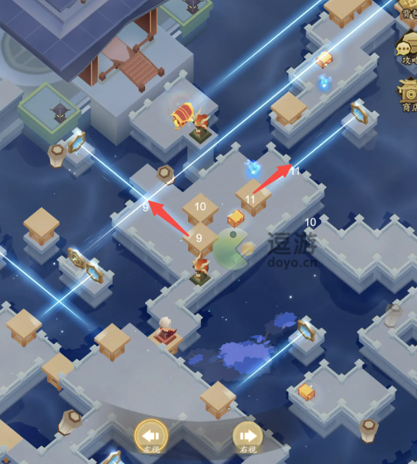 7、第七步:此时若有伙伴阵容可以在商店购买【复活圣水】让主力回到战场,如若角色状态良好则购买降低敌方攻击与防御的符咒。解决拦路虎后需要将9号箱推动到两束光线交汇处遮挡,将11号箱推动到底。小精卫为道友标注了推动方向和目的点。最后将10号箱推到下方搭桥,别忘了领取剑意和宝箱哦~