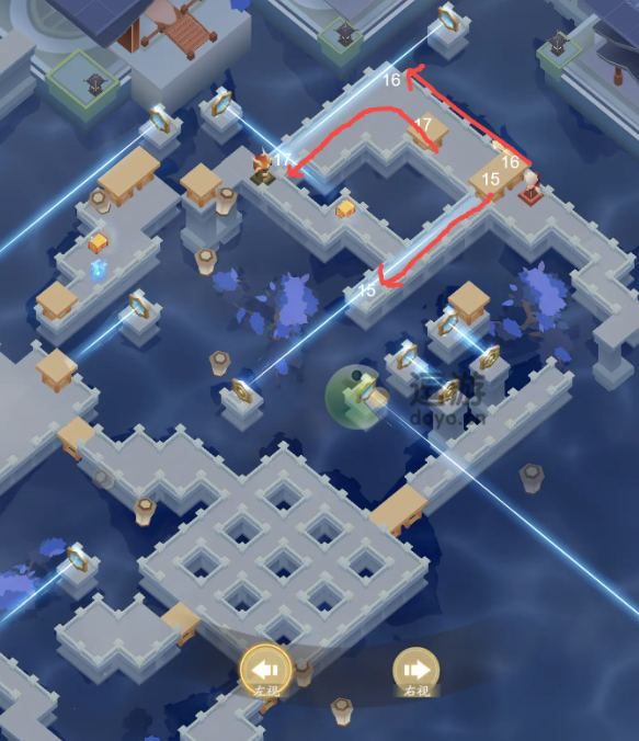 8、第八步:P1此处难度并不大,需要按顺序将箱子推动到指定地块,小精卫标注好了数字与推动方向~先按系统提示方向推动12号箱腾出空间,再按箭头顺序将14和15号箱推动到空隙搭桥筑路,领取对应区域的宝箱,15号箱可能需要绕一圈才能推动哦P2最后先推动13号箱再推动12号箱,两个箱子即可打通前往下一区域的路~沿着满是激光的路线行走,只需不停切换左右视角即可通过。