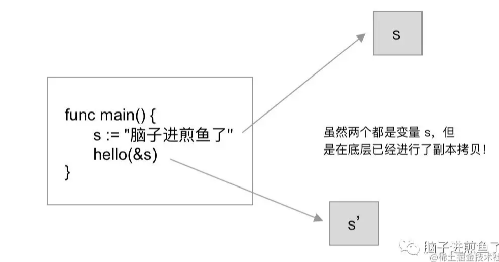 从结果来看,两者的内存地址一样,也成功的变更到了变量 s 的值。这难道不是引用传递吗,煎鱼翻车了?