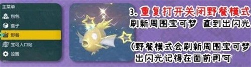3:最后一个方法,可以使用野餐,重复打开在关闭野餐模式,这样就可以刷新周围的宝可梦了,直到有闪光出现就好了,出闪光的时候可以在面前激进行存档;