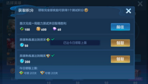 每天选择两位高熟练度的英雄去通关能力测试,领取奖励后总共能拿到2个测试积分。