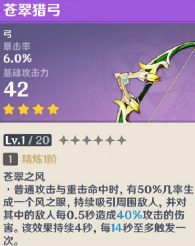 攻击后生成一个小型聚怪漩涡,不能说毫无卵用,只能说聊胜于无,但触发概率只有可怜的50%,即便是精5也需要10秒CD。实在是大毒瘤了,稻妻的破魔之弓优先级都要高出它太多,如果你年幼无知选了它,那只能祈祷你还没精5了。