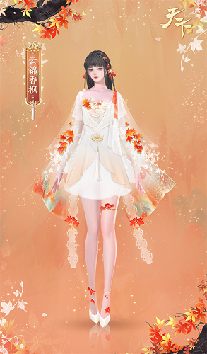 霜打红叶,泼染山红。珍珠几颗穿于红枫丝带,恍若采撷晨露的枫叶。飘落至少女乌发间,裙面用香槟色云锦裁剪而成,衣襟处绣成猫咪模样。以透明雪纺为袖,覆一层满是红叶的渐变彩纱,为这衣裙增添了几分亮色。腰间束起的蕾丝垂落身后,裙摆披纱摇曳,似有金粉洒落。腿部绑上枫叶环作装饰,配上缎面的踝带鞋更显修长,梦幻灵动,仿佛是翩翩仙子踏枫而来。