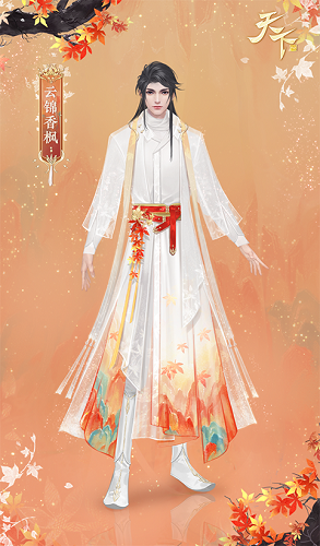 少侠将乌黑秀发披散背后,两鬓发丝垂落至胸前,着一身素白云锦,气度不凡。银丝织入缎面,制成偏襟白袍,外拢一件暗花纹绣的轻纱,令这身装扮多了些许仙气。金红腰封紧束腰间,垂挂一串金丝红枫飘摇欲坠。衣摆处织绘出千里江山,呈现出叶落山间,漫红嵌黛之景。少侠迈出的每一步,都似有辽阔山河随行。